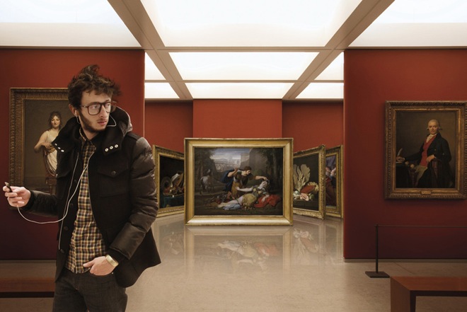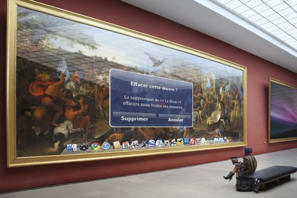 L’ispirazione è arrivata osservando i visitatori del museo parigino che nella maggior parte dei casi fruivano delle opere accompagnati da Iphone, Ipad o MacBook.